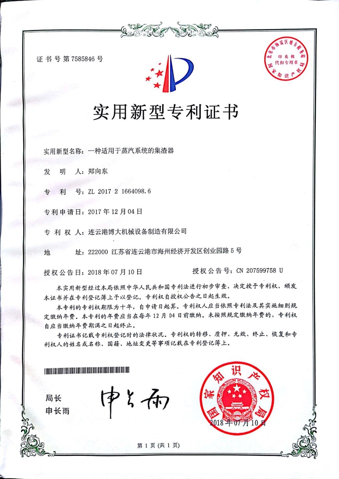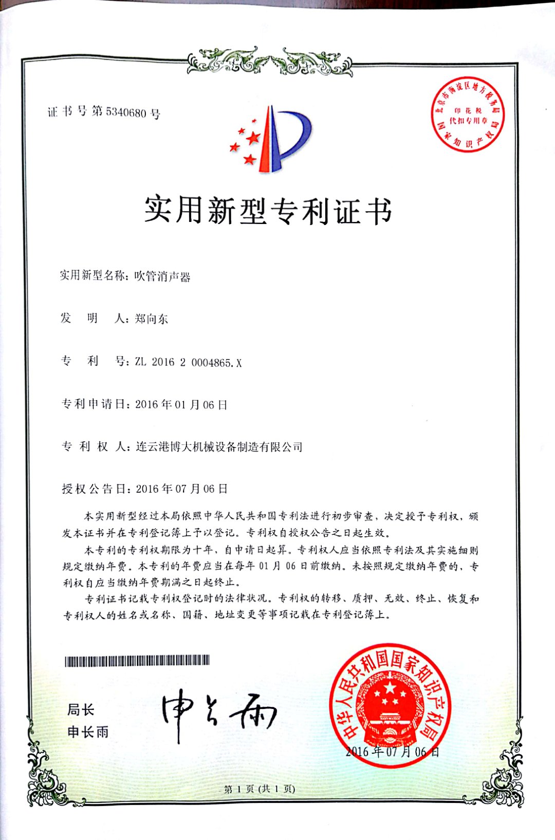 吹管消聲器 發(fā)明專利證書