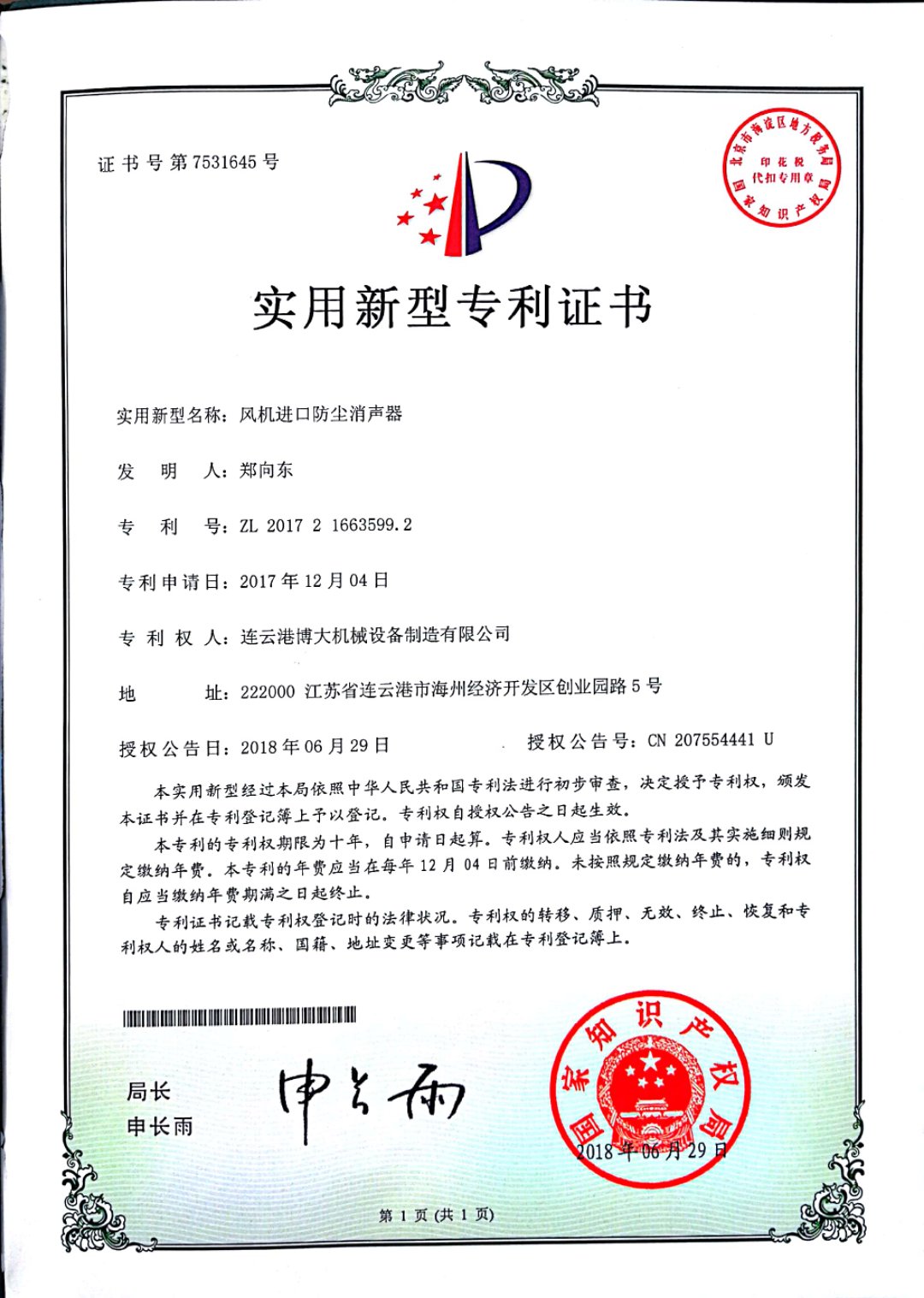 風(fēng)機進口防塵消聲器 專利證書